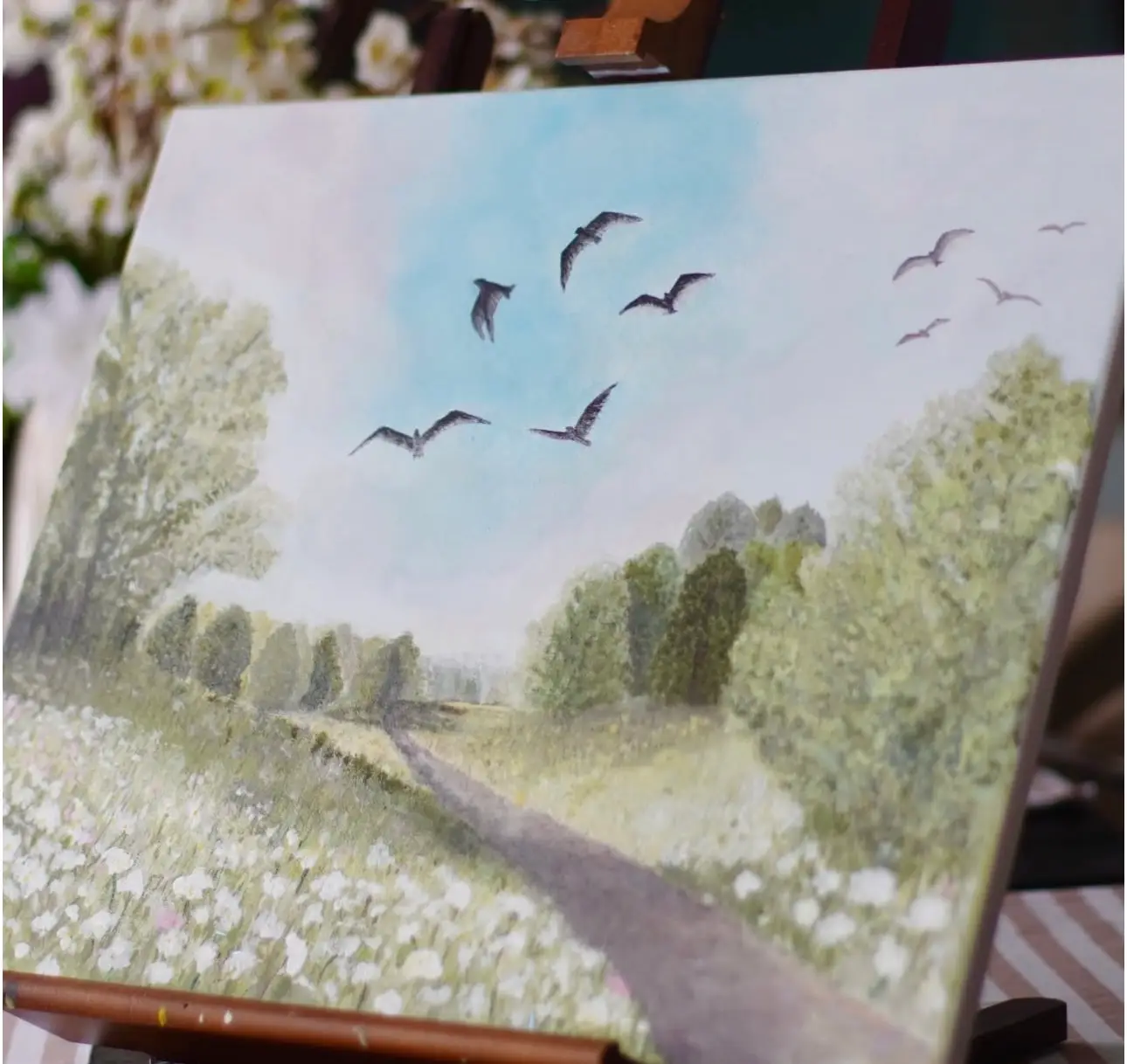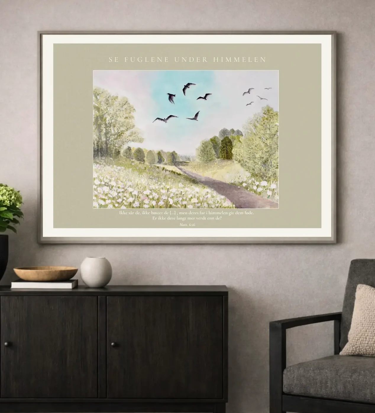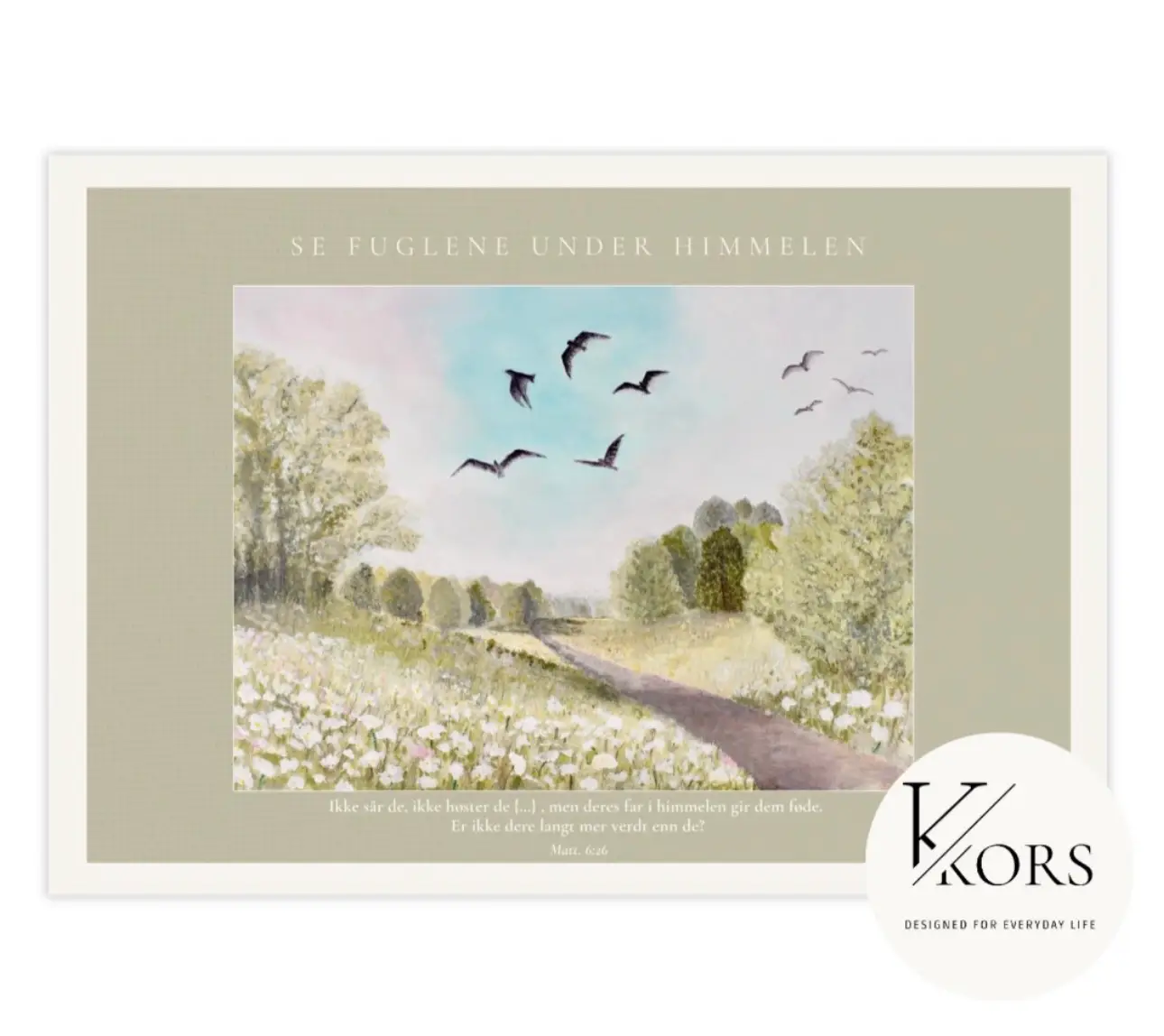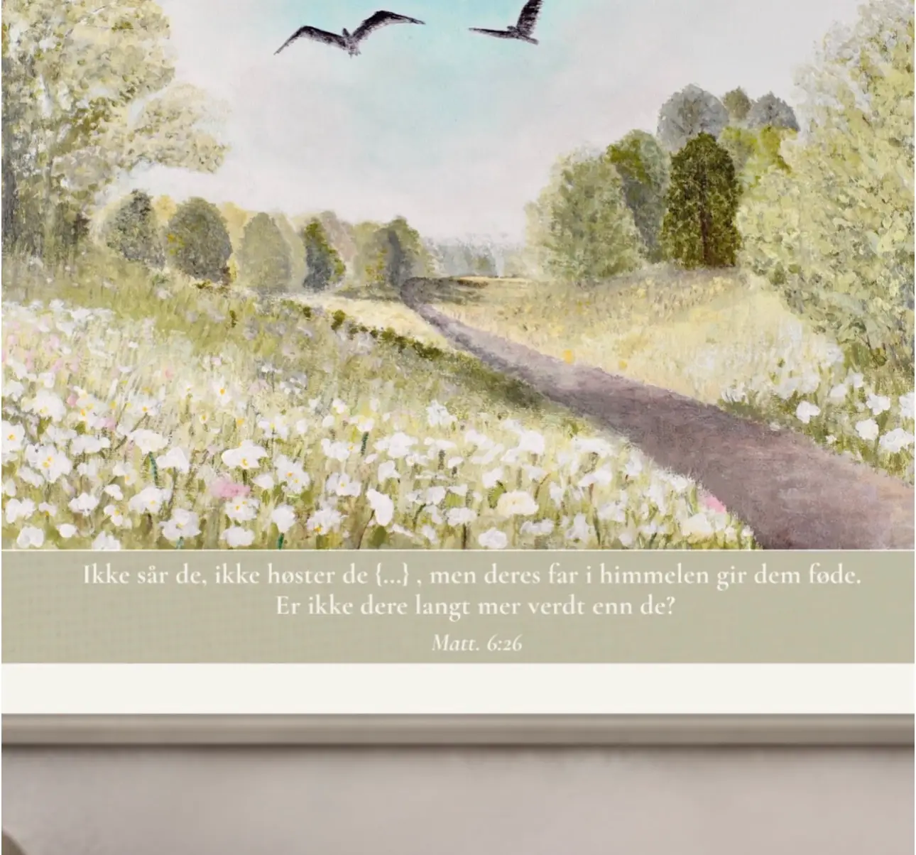 Se fuglene under himmelen er et rolig og tidløst kunsttrykk. Det er håndmalt av meg, og overført til print. Det myke landskapet, de svevende fuglene og de dempede naturfargene er valgt for å gi en følelse av ro, fred, og tilhørighet. Et bilde som minner oss om å senke skuldrene og finne hvile i det enkle.
