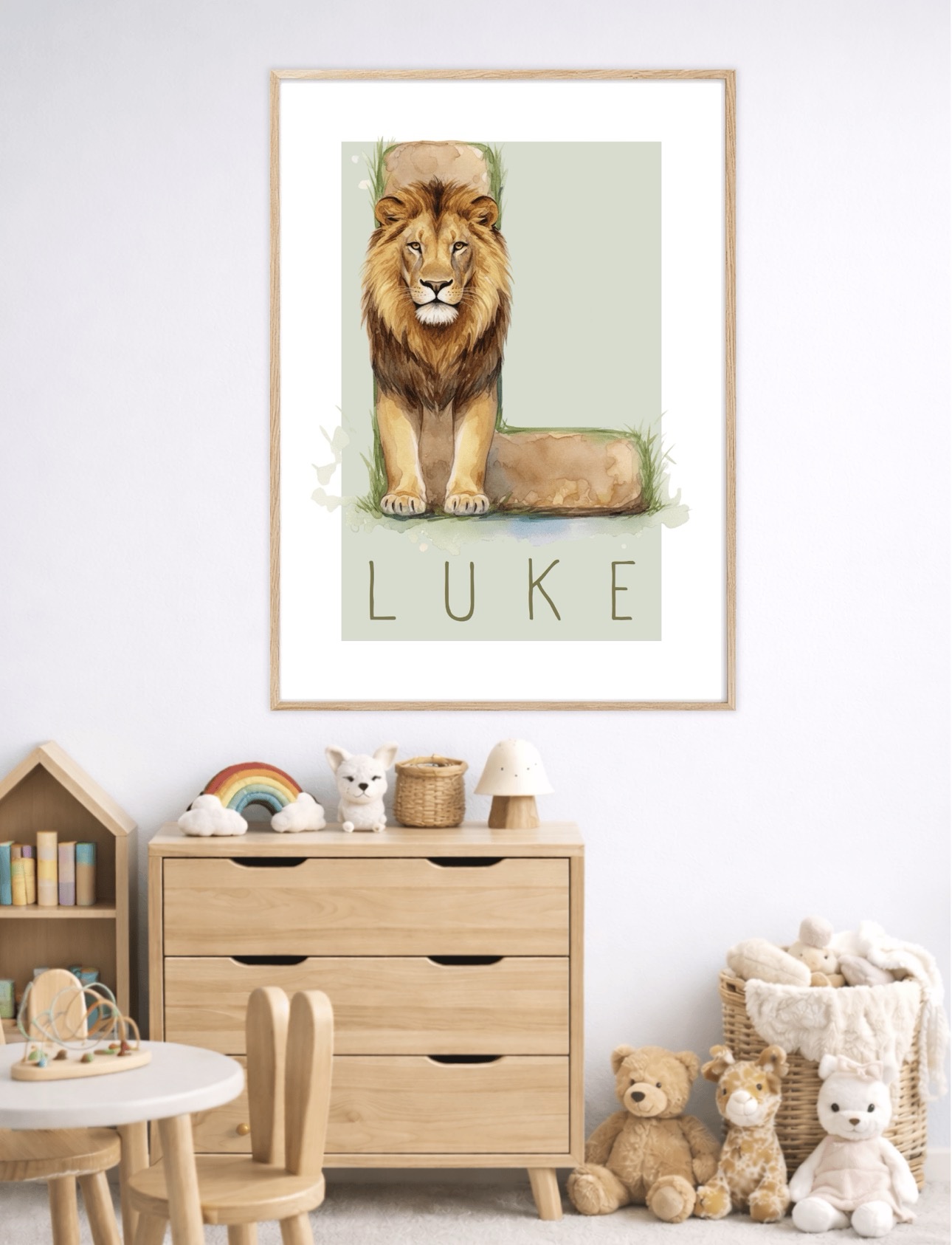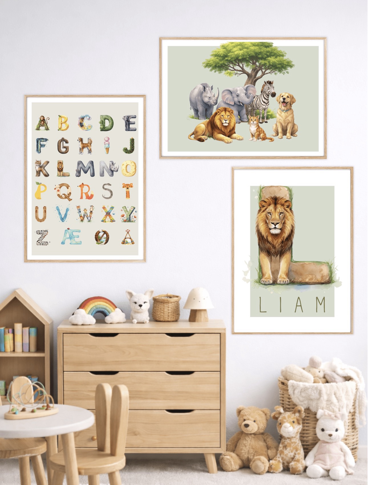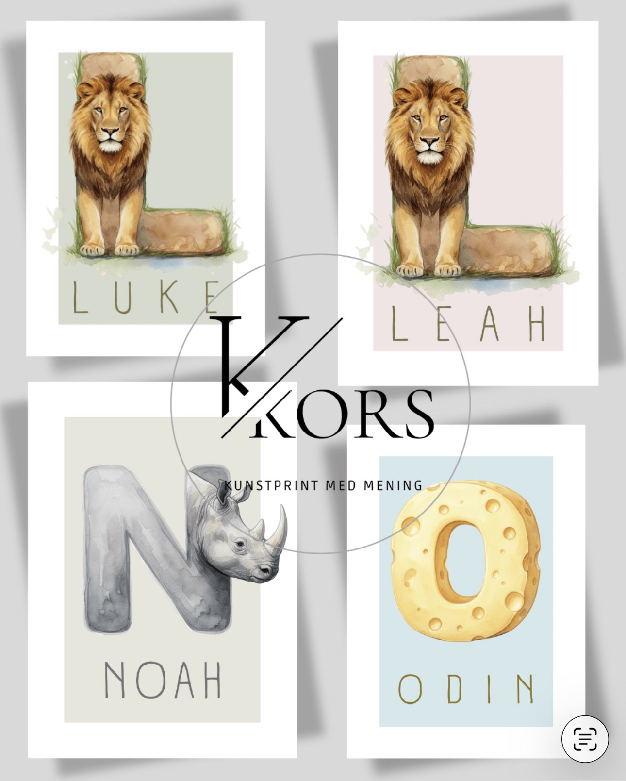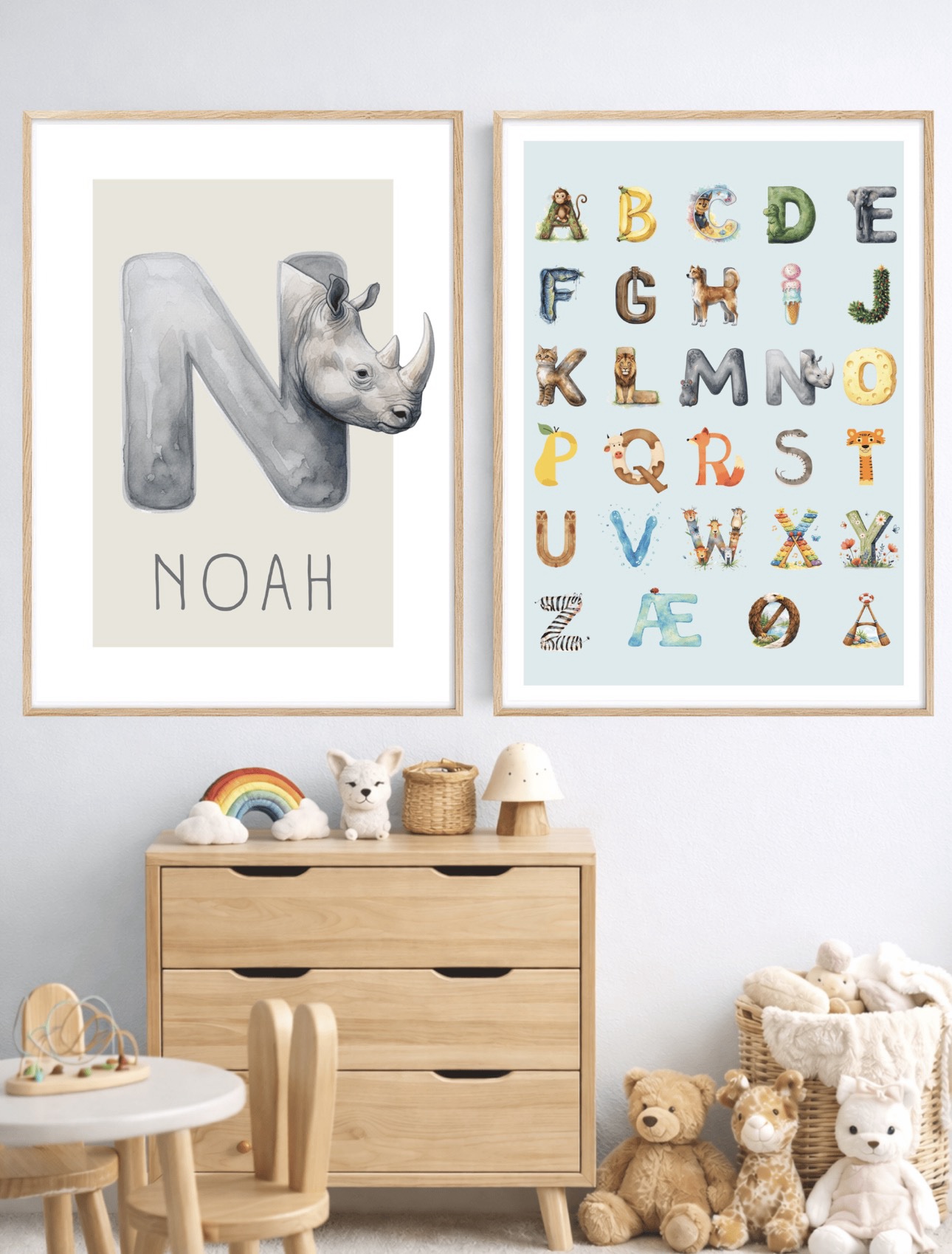 Som en del av «lær alfabetet» kolleksjonen, har du her mulighet til å få barnets bokstav og navn som et eget bilde. Perfekt for at barnet skal lære å skrive eget navn, og som ekstra dekor på barnerommet.