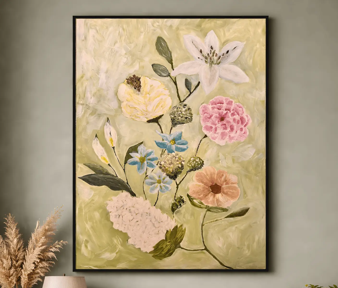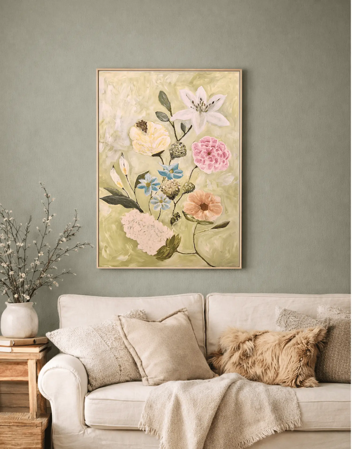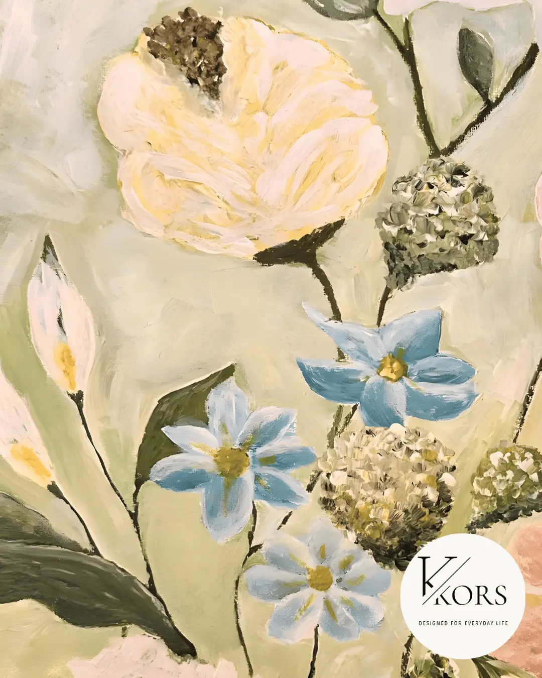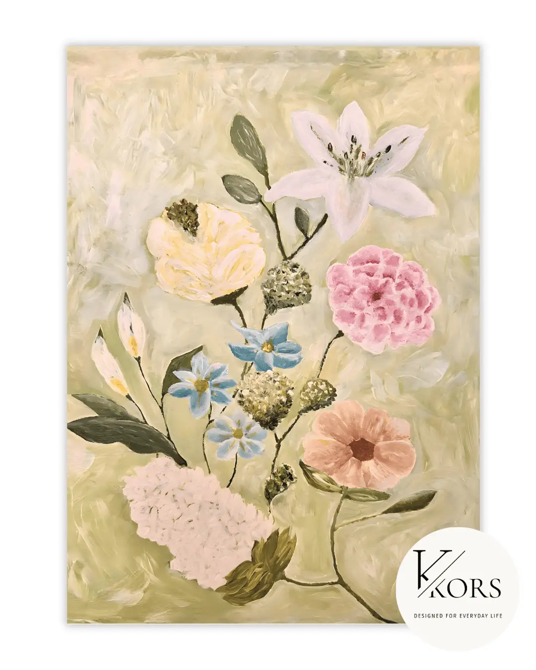 Sommerbris er et fargerikt og harmonisk kunsttrykk, basert på håndmalt motiv. skapt for å forsøke å bringe naturens ro og glede inn i hjemmet. De håndmalte blomstene i duse pasteller skaper et levende, men balansert uttrykk – perfekt for stue, soverom eller gang.