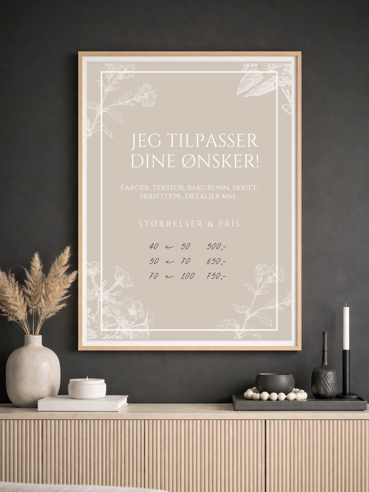 Jeg lager utkast som du kan velge mellom, UTEN kjøpeplikt. Deretter legges de siste detaljene og finjusteringer til – og printet bestilles, etter godkjenning fra deg 🩷